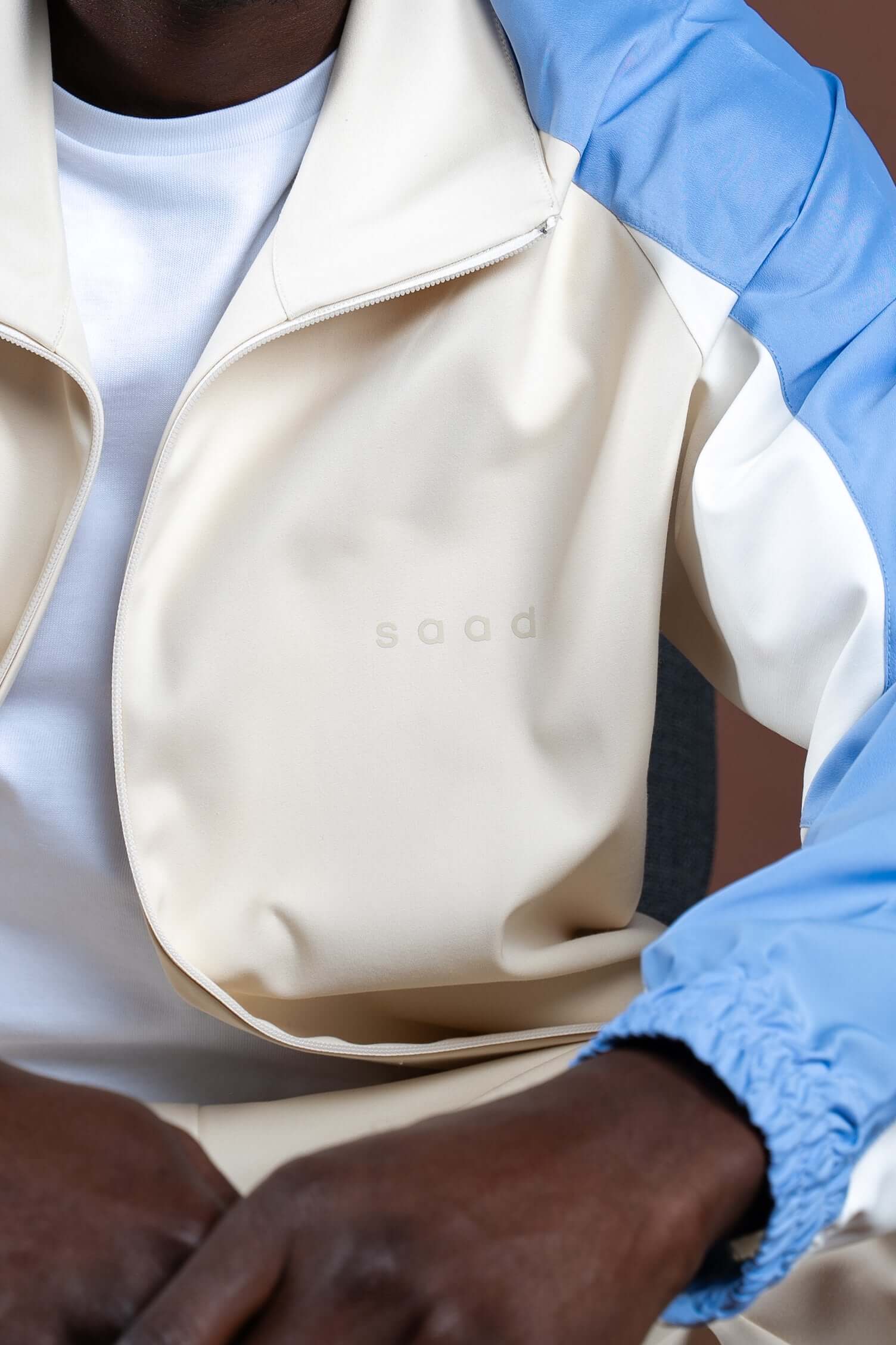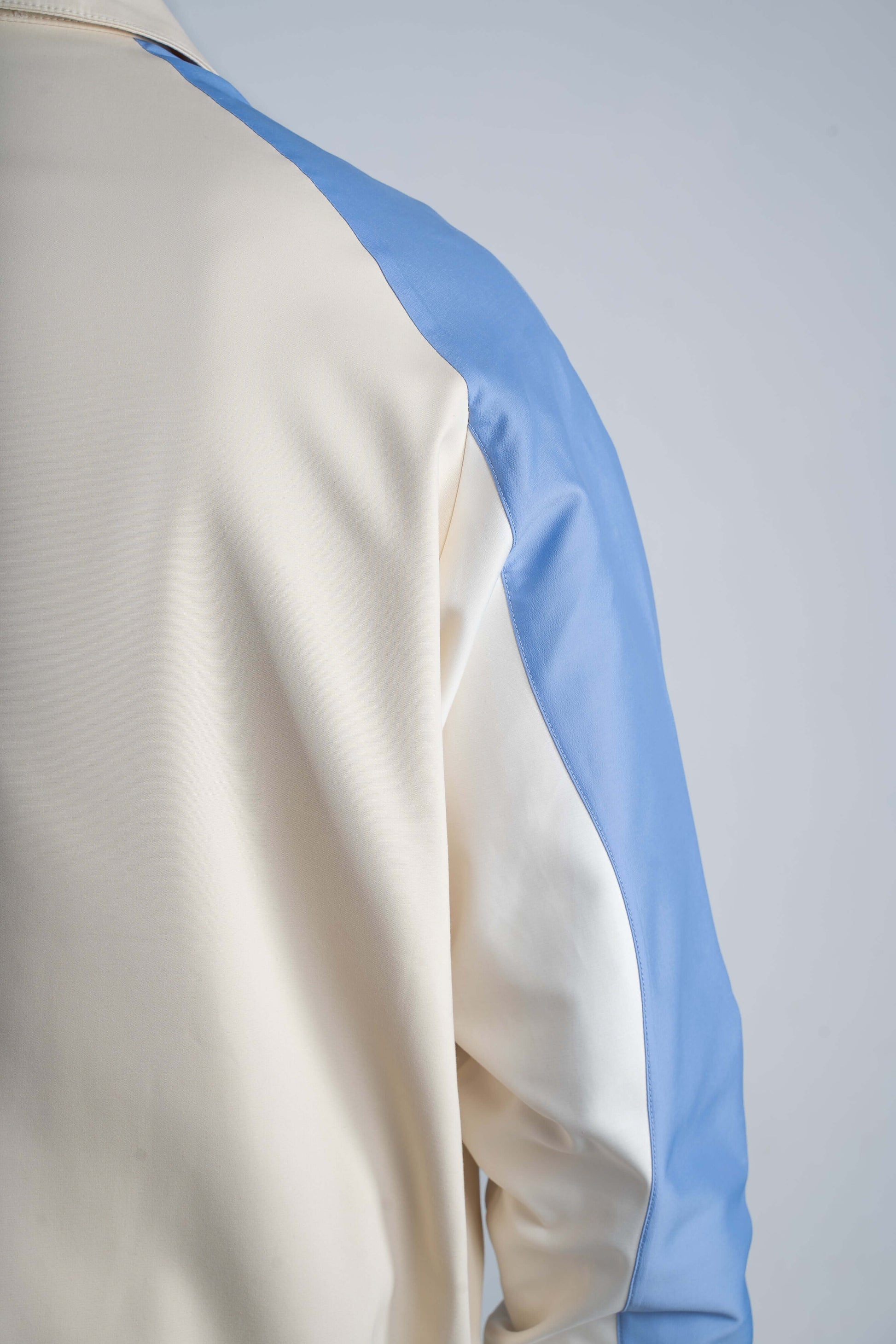 Veste zippée en satin de coton technique avec empiècements sur les manches.